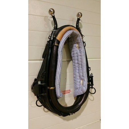 Nous vous proposons le Collier de traction ajustable pour le travail et l'attelage en pack de démarage avec pad et crochets d'attelles. Les attelles sont réalisés en acier peint en noir et des boules en inox, les attelles sont munies d'anneau porte guides , d'anneaux de courroies de maintient et de chapes pour crochets. Les crochets sont réalisé en acier forgés peint en noir. Ils vous permettent de fixer directement vos traits ou avant traits. Sur ce type de crochets vous pouvez montez du traits nylon , traits en chaînes ou en corde. Le corps de collier est réalisé en paille garnit de cuir pleine fleur d'excellente qualité de couleur noir. Le corps de collier est ouvrant sur le dessus. Ce collier de traction est idéale pour vos chevaux grâce à son chapeau d'ajustage, il permet de modifier la taille de votre collier de -2 cm et +2 cm par rapport à la taille initiale.