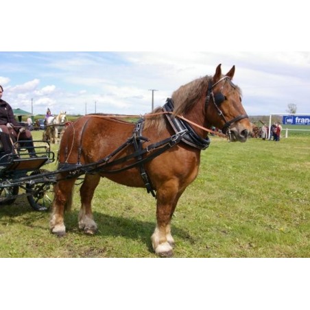 La société Tract Horse Équipement vous propose le harnais d’attelage cuir maison collier en simple comprenant une paire de guide antidérapante en grip pour la main et cuir en embouchure ainsi qu’une bride avec ou sans œillères. Le harnais comprend un collier de traction non ajustable avec des attelles. Les attelles sont disponibles en acier peint , .Le harnais d’attelage cuir maison collier en simple est équipé d’une sellette avec 2 clés de sellettes et une clé de mise au jockey. Le harnais dispose d’une dossière coulissante en cuir et doublé nylon renforcé. Le harnais d’attelage cuir maison collier en simple est fournis avec un reculement. L’avaloire du harnais comprend de 2 courroies de retraite, de 2 portes traits et de 3 barres de fesse. Les barres de fesse du reculement peuvent se régler en coulissant dans la croupière et sont facilement changeables. La croupière possède un culeron démontable pour plus de facilité. Le harnais d’attelage cuir maison collier en simple dispose d’une courroie de liaison entre le collier et la sellette. Cette courroie est fabriquée sur mesure en matériaux élastique et est fixée par des mousquetons en inox. Ce harnais comprend des traits de la matière de votre choix, soit en cuir de 32 millimètres de largeur doublé nylon soit en corde finition chaîne inox . en série le harnais est livré avec des ronds de brancards .