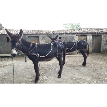 le harnais d'attelage en cuir pour âne en paire dispose d'une bouclerie inox .