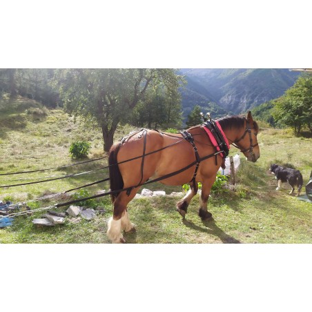 Le harnais de traction pour cheval de trait synthétique se compose d’une paire d’avant traits conçu sur mesure ils sont reliés à un anneau qui est le point de solidité de ce harnais. En effet de cet anneau repart le trait, la descente de surcou et le sanglons de sous ventrière. Le surcou est réalisé en biothane ou en cuir il sert de guide au courroie de retenue haute de collier. Les traits sont réalisé sur vos mesures, ils peuvent être en sangle polypropylène, en cuir ou en chaîne , leurs terminaisons sont en maillons de chaîne tournants inox ou galva. Pour la “main arrière” du harnais vous avez un reculements avec croupières d'où partent les deux courroie de retenue de collier. Il est composé d’un avaloir et de deux descente indépendante. des courroies portes traits sont disposées à droite et à gauche du reculements pour guider les trait durant le travail . Pour le maintien des traits au repos nous avons fixé deux boucles spéciales qui soutiennent les trait quand ils ne servent pas. La bouclerie de ce harnais est mixte acier et inox. Il peut être converti en harnais de paire en ajoutant chaînettes et courroies de liaisons. Modèle vendu à la pièce et sans collier.