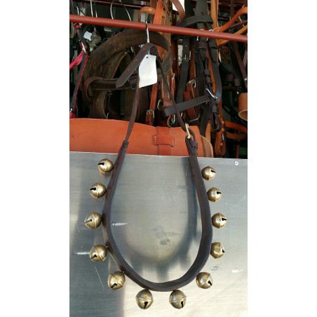 La grelotière tour de cou se place autour du cou de votre animal se fixant sur le haut de la bride grâce à sa courroie de tête. La grelotière est réglable en longueur. La grelotière permet de rythmer votre équidé et de prévenir de son arrivé. La grelotière tour de cou cuir est d’une excellente sonorité grâce à ses 12 grelots. L’utilisation du tour de cou est destiné à de l’attelage de loisir ou de présentation.