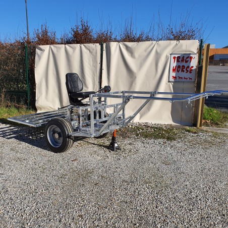Tract Horse Équipement vous expose le “robuste” avant-train hippomobile 2 roues galvanisé à chaud. Le robuste est composé d’un châssis tubulaire (diamètre du tube principal 60x40 mm), largeur du châssis de 100 cm, voie de l’engin de 130 à 170 cm. Le “robuste” possède une paire de roues pneumatique renforcées (220/55/R14.5) type profil route, un essieu non suspendu avec une charge admissible de 1800 kg, des freins à disques avec commande aux pieds, une boule d’attelage standard ( diamètre 50 mm). Le “robuste” est composé d’un cadre arrière standard (130x80 cm). Le levage du cadre se fait grâce à un treuil par déclenchement aux pieds. Les brancards sont réglables en longueur et en largeur, le diamètre du tube de brancard est de 42 mm. Dans sa version de base le “robuste” possède un siège faucheuse suspendu par une suspension pneumatique réglable. Le poids du robuste avant-train hippomobile 2 roues galvanisé dans sa version standard est de 200 kg. Tract Horse Équipement suggère en option pour votre avant train “robuste” 2 roues : un siège suspendu type tracteur, les roues renforcées profil pneu longitudinal, la caisse à outils, le relevage hydraulique. Nous vous proposons également en option le “robuste” convertible en attelage paire avec les départ de brancards démontables permettant ainsi l’utilisation du timon et de la balance de paire. Nous vous rappelons que le prix de l’avant train hippomobile “robuste” 2 roues galvanisé varie selon les options.